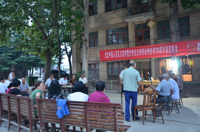 初秋的傍晚已現涼意,但代王隊部大門口卻響起了熱鬧的音樂聲,原來是隊離退辦組織離退休職工“秦腔自樂班”以唱秦腔形式紀念抗戰勝利70周年。閃光燈下,“紀念中國人民抗戰勝利暨世界反法西斯戰爭勝利70周年”橫幅赫然在目。8點15分演出正式開始。一折程老生的“大報仇”劃過夜空,成為晚會的首曲,緊接著是“青衣”、“花臉”輪番上場,正是你方唱罷我登場,場面熱鬧而有序,表現出了離退休職工高昂的愛國主義熱情和對和平生活的贊美之情。