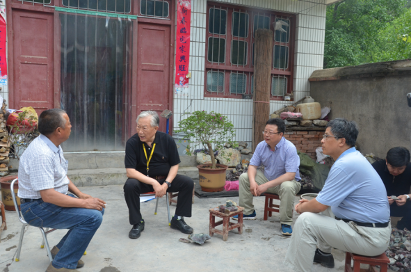 上山察看后,老部長(zhǎng)又來張華溝礦點(diǎn)劉吉村村民王新海的院子,察看了當(dāng)?shù)卮迕耖_采的瑪瑙礦石,調(diào)研瑪瑙石礦民采情況,并在村民院子,饒有興趣的與我隊(duì)寶玉石礦項(xiàng)目部技術(shù)人員和村民進(jìn)行了交流,關(guān)切地詢問技術(shù)人員的數(shù)量、生活及車輛租用費(fèi)用等情況。項(xiàng)目負(fù)責(zé)高虔認(rèn)真地一一回答了老部長(zhǎng)的問詢。