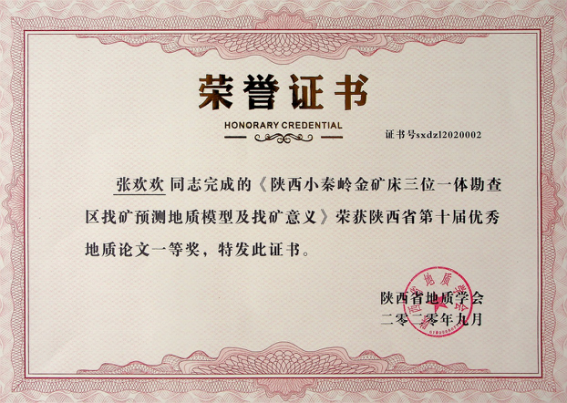 由我公司地調(diào)所編制完成的“小秦嶺金礦田深部及外圍金礦整裝勘查區(qū)(陜西)礦產(chǎn)調(diào)查找礦預(yù)測(cè)子項(xiàng)目(石門(mén)幅)成果報(bào)告”獲陜西省第十屆優(yōu)秀地質(zhì)成果三等獎(jiǎng);張歡歡同志撰寫(xiě)的“陜西小秦嶺金礦床三位一體勘查區(qū)找礦預(yù)測(cè)地質(zhì)模型及找礦意義”獲優(yōu)秀地質(zhì)論文一等獎(jiǎng);李長(zhǎng)壽同志撰寫(xiě)的“陜西小秦嶺金礦田石英脈型金礦床石英熱釋光特征及其找礦意義”獲優(yōu)秀地質(zhì)論文三等獎(jiǎng)。